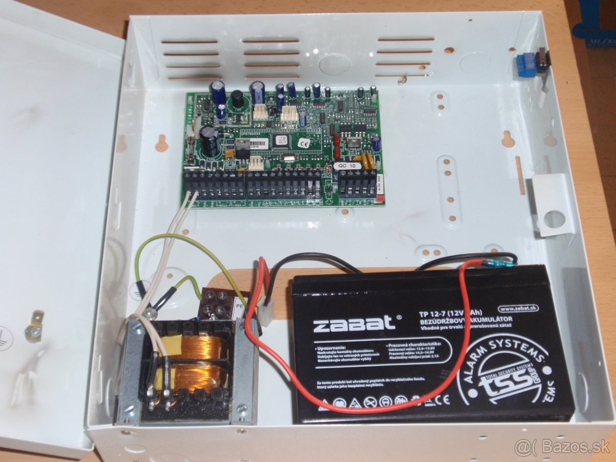V plastovej skrini ústredne je sieťový zdroj a je tu priestor pre akumulátor. 1,3 alebo 2,6 Ah