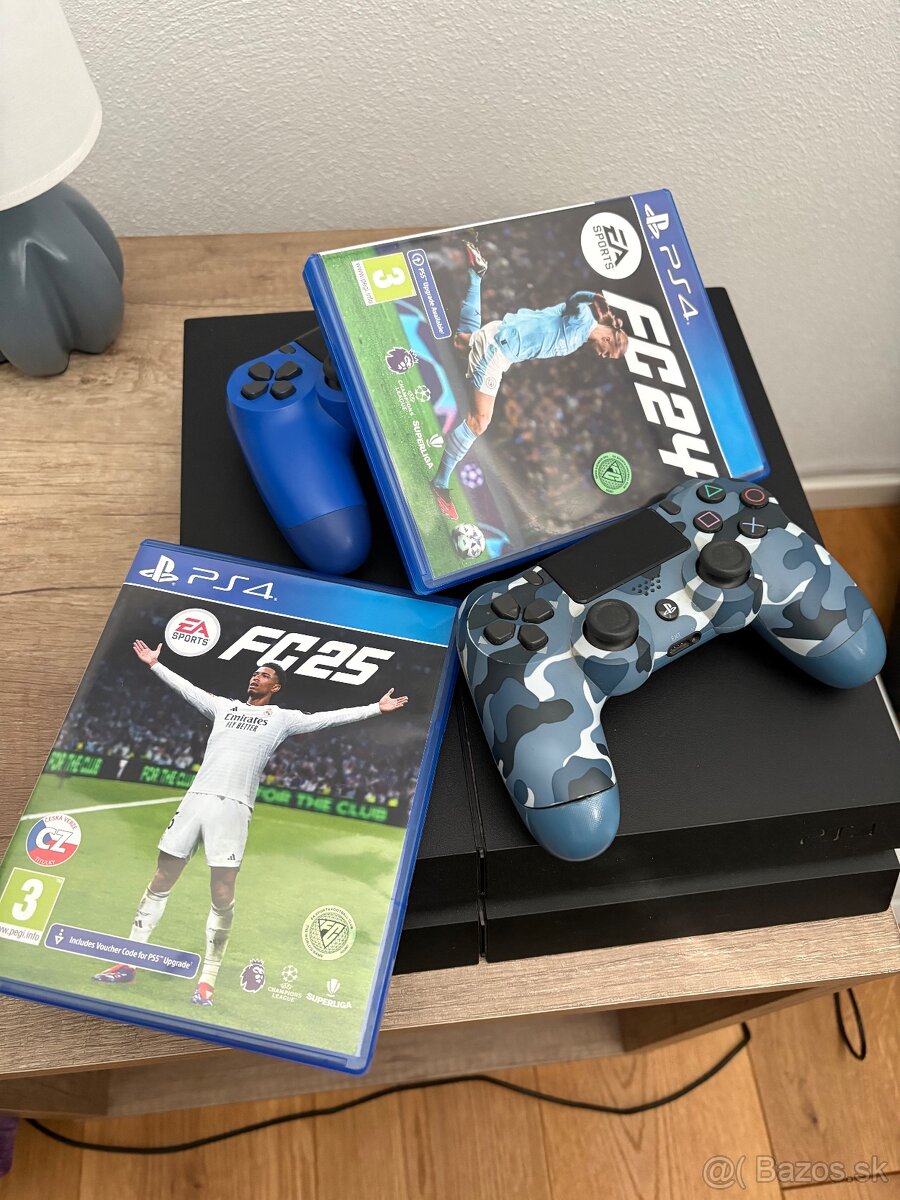 Predám použité ps4 rok výroby 2013 . Ku konzole pridávam 2 ovládače . Modrý ovládač ma poškodenú pravú páčku ale inak je funkčný . Konzole chyba kábel na nabíjanie ovládačov inak je bez chýb , + pridávam hry FC 24 , FC 25 . Cena pevná .