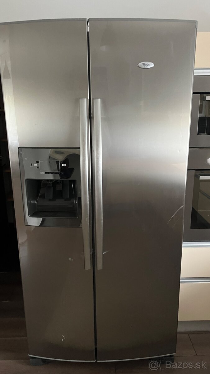 Predám americkú chladničku Whirlpool side-by-side v nerezovom prevedení (chladnička + mraznička). Má dávkovač vody/ľadu v dverách.