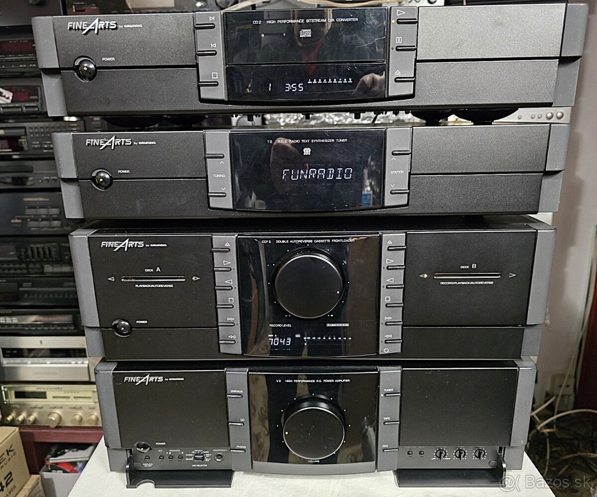 Ponúkam túto výbornú kompletnú zostavu od firmy Grundig z ich najvyššej modelovej rady Fine Arts.Zostava je vo výbornom optickom aj technickom stave a skladá sa z integrovaného zosilňovača V3, dvojkazetového magnetofónu CCF3, cd prehrávača CD2 , tunera T2 a 2 veľkých stlpových reproduktorov BX3 MKII. Samozrejme je k dispozícii originálny diaľkový ovládač.V tejto kompletnej konfigurácii a stave absolútne zriedkavé !!