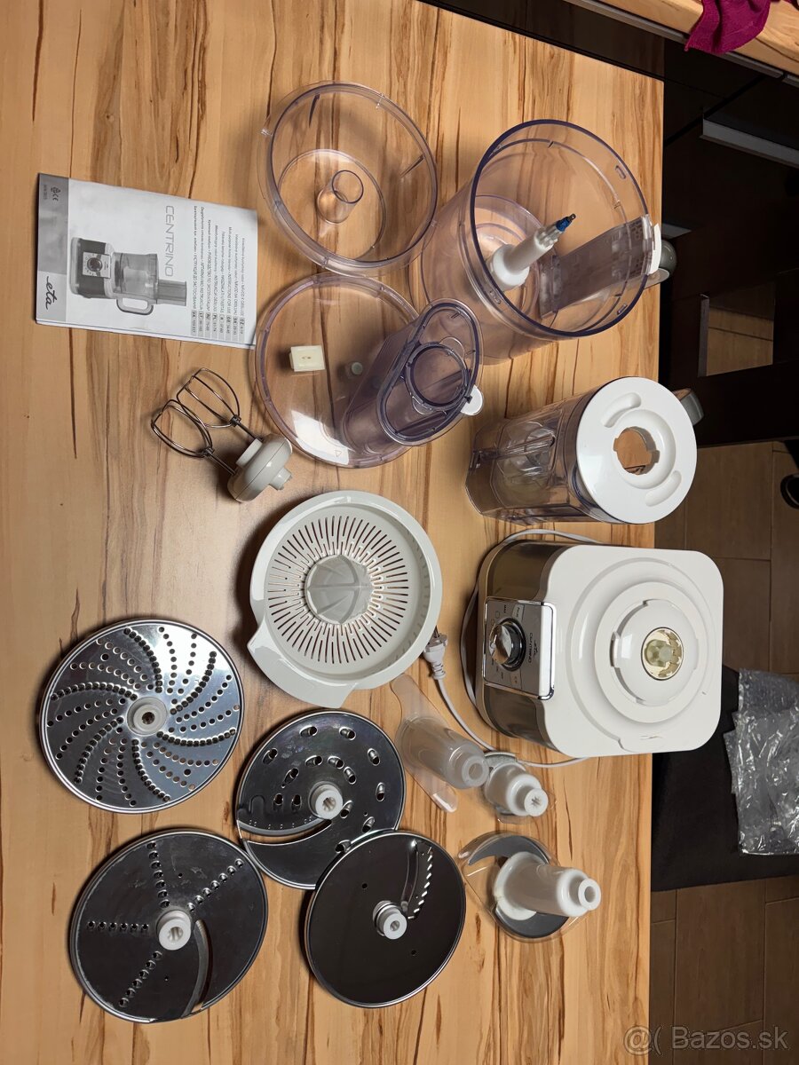 Eta 022 - [3.3. 2026]Predám kompletný kuchynský robot eta 022, málo používaný, funkčný. Obsahuje malú a veľkú nádobu, šlahač, hnetač, mlynček na mäso, mak, struhač, mlynček na kávu, malú a veľkú mixovaciu nádobu