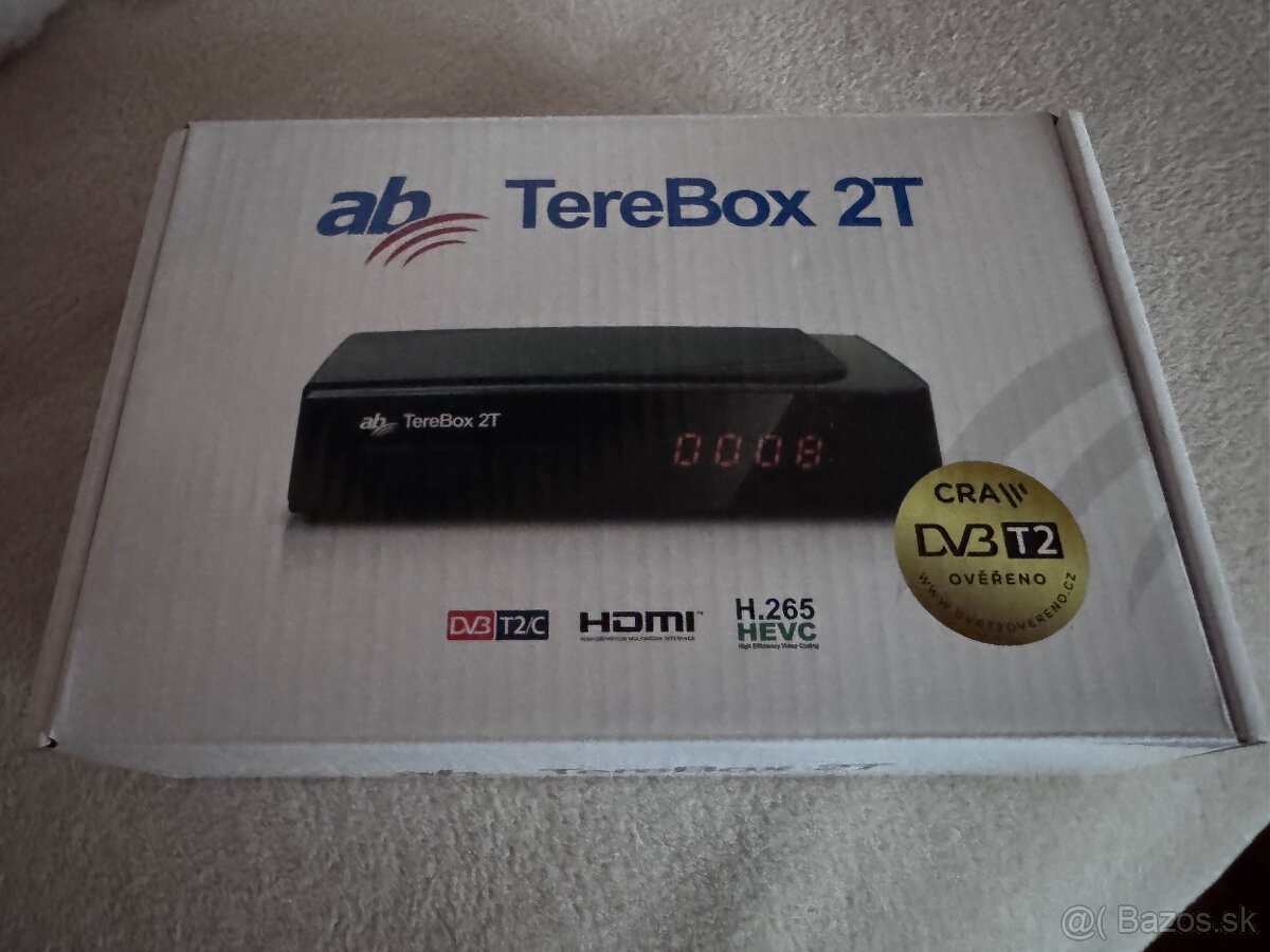 Terestriálny a káblový prijímač AB TereBox 2T v menšom vyhotovení sa pýši certifikáciou DVB-T2. Jedná sa o cenovo dostupný model pre príjem pozemného a káblového vysielania v moderných štandardoch DVB-T2/T i DVB-C, s podporou kodeku H.265/HEVC a zvukového formátu Dolby Digital. Výhodou tohto šikovného zariadenia je pripravenosť na moderný HDMI vstup, ale aj starší SCART, ktorý umožňuje pripojenie aj starších typov televízorov. Prijímač zároveň disponuje možnosťou prehrávania obsahu vo full HD rozlíšení a umožňuje nahrávanie programov v reálnom čase. Súčasťou balenia je okrem samotného prijímaču aj diaľkové ovládanie a externý napájací zdroj.
