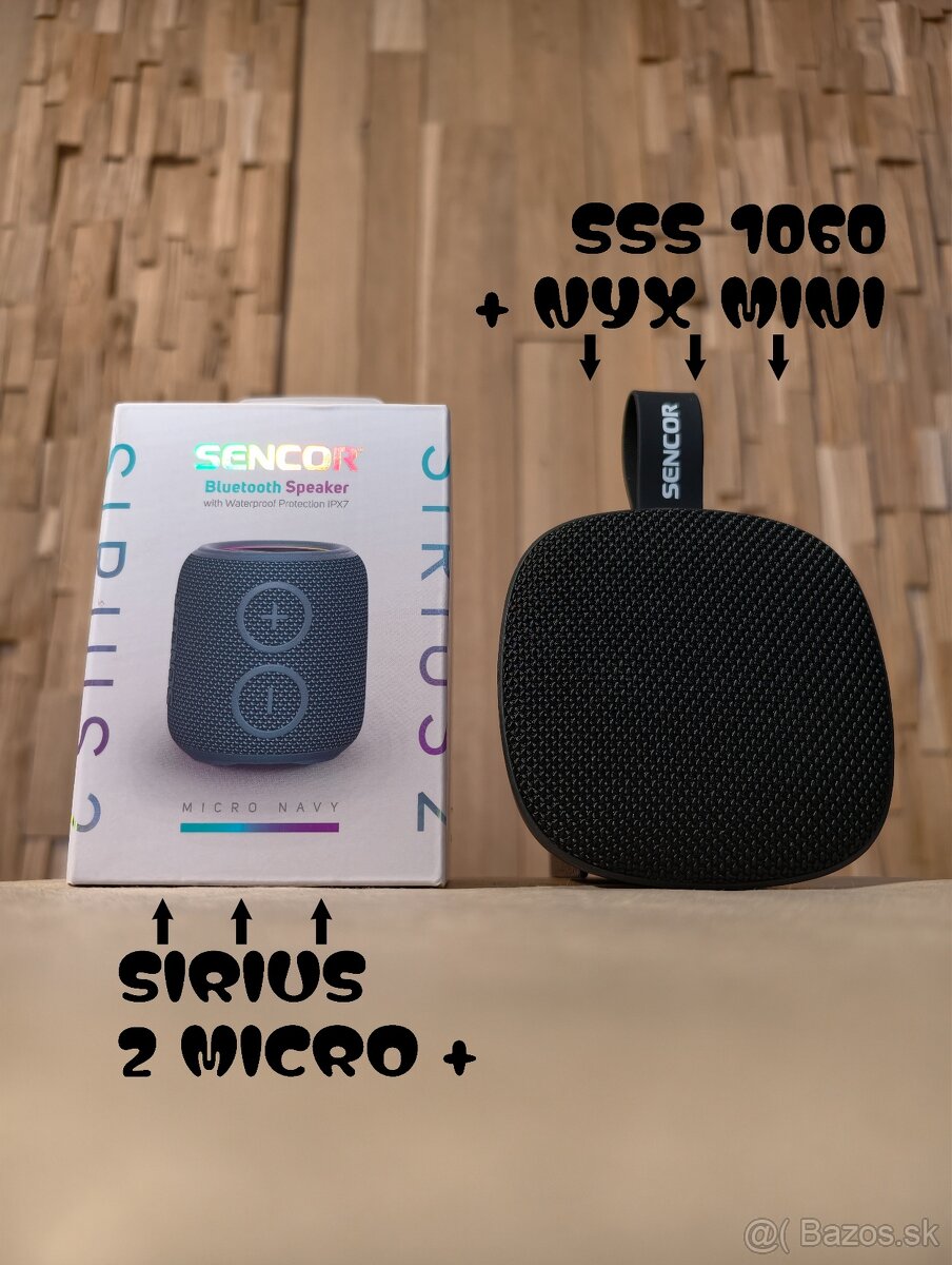 Sada dvoch nových nepoužívaných prenosných Bluetooth reproduktorov - Sencor SIRIUS 2 Micro (nerozbalený) vo farbe Navy a Sencor SSS 1060 NYX Mini (bez škatuľky) vo farbe Black.